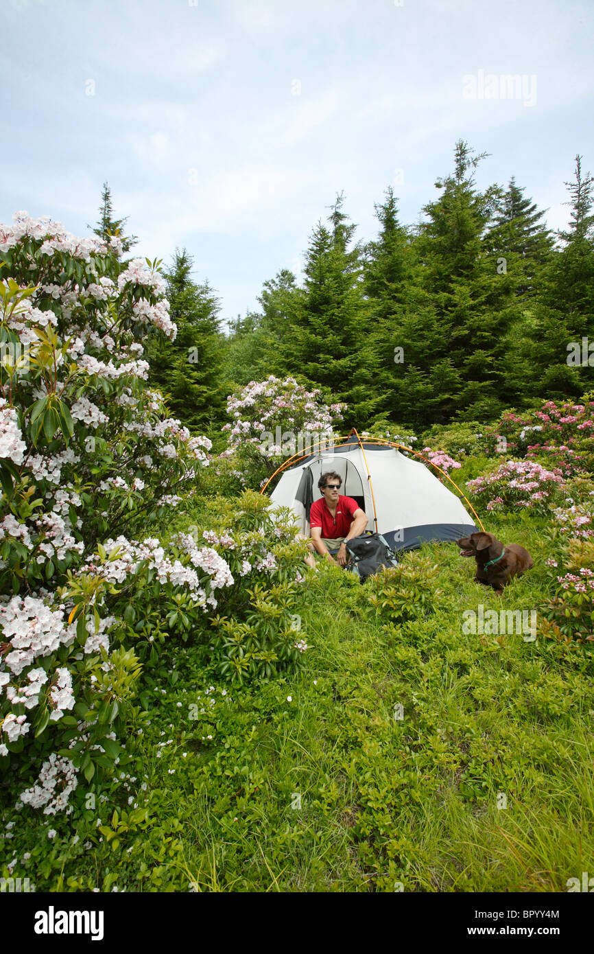Male Hiker With Dog At Campsite Amidst Blooming Mountain Laurel In