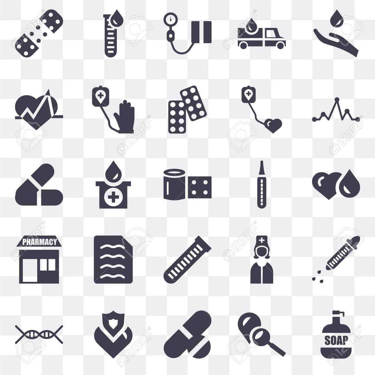 Set Of 25 Transparent Icons Such As Soap Blood Pill Health