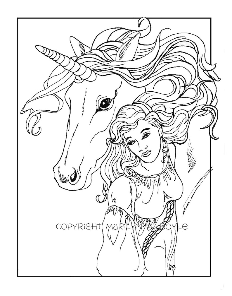 Adult Coloring Page Digital Download Maiden And Unicorn Etsy